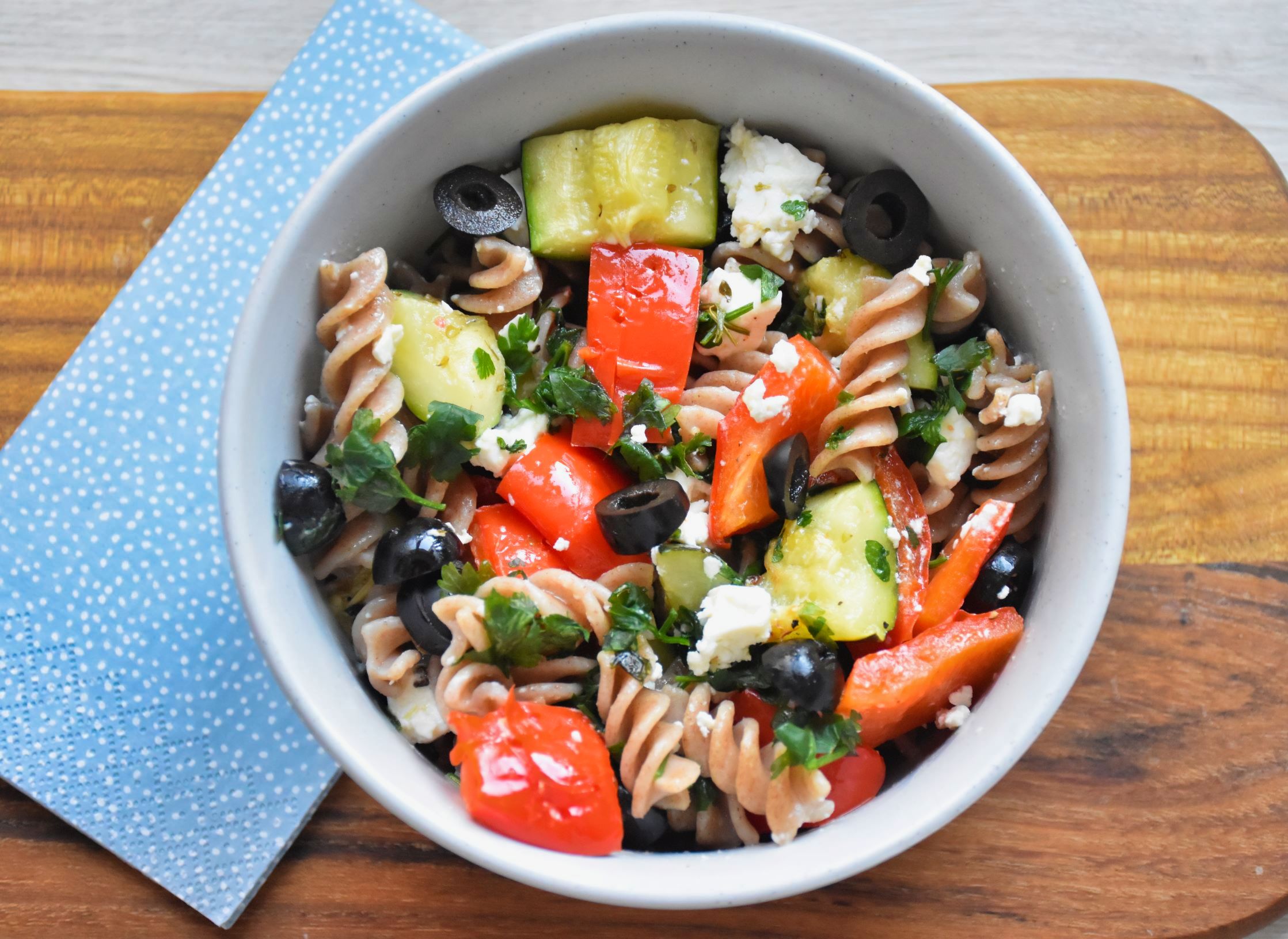 Cukinię i paprykę pokrój na ćwiartki, skop łyżką oliwy, dopraw solą i pieprzem. Piecz w piekarniku przez ok. 30 minut w 190 stopniach C (grzanie góra dół). W międzyczasie ugotuj makaron. Na patelni zeszklij czosnek z pozostałą oliwą, dodaj upieczone i pokrojone w kostkę warzywa, oliwki, makaron i pokruszony ser. Całość dokładnie wymieszaj i posyp ziołami.