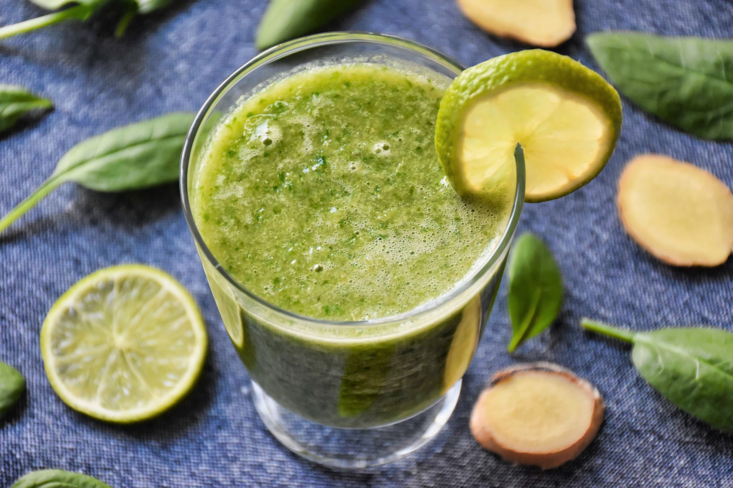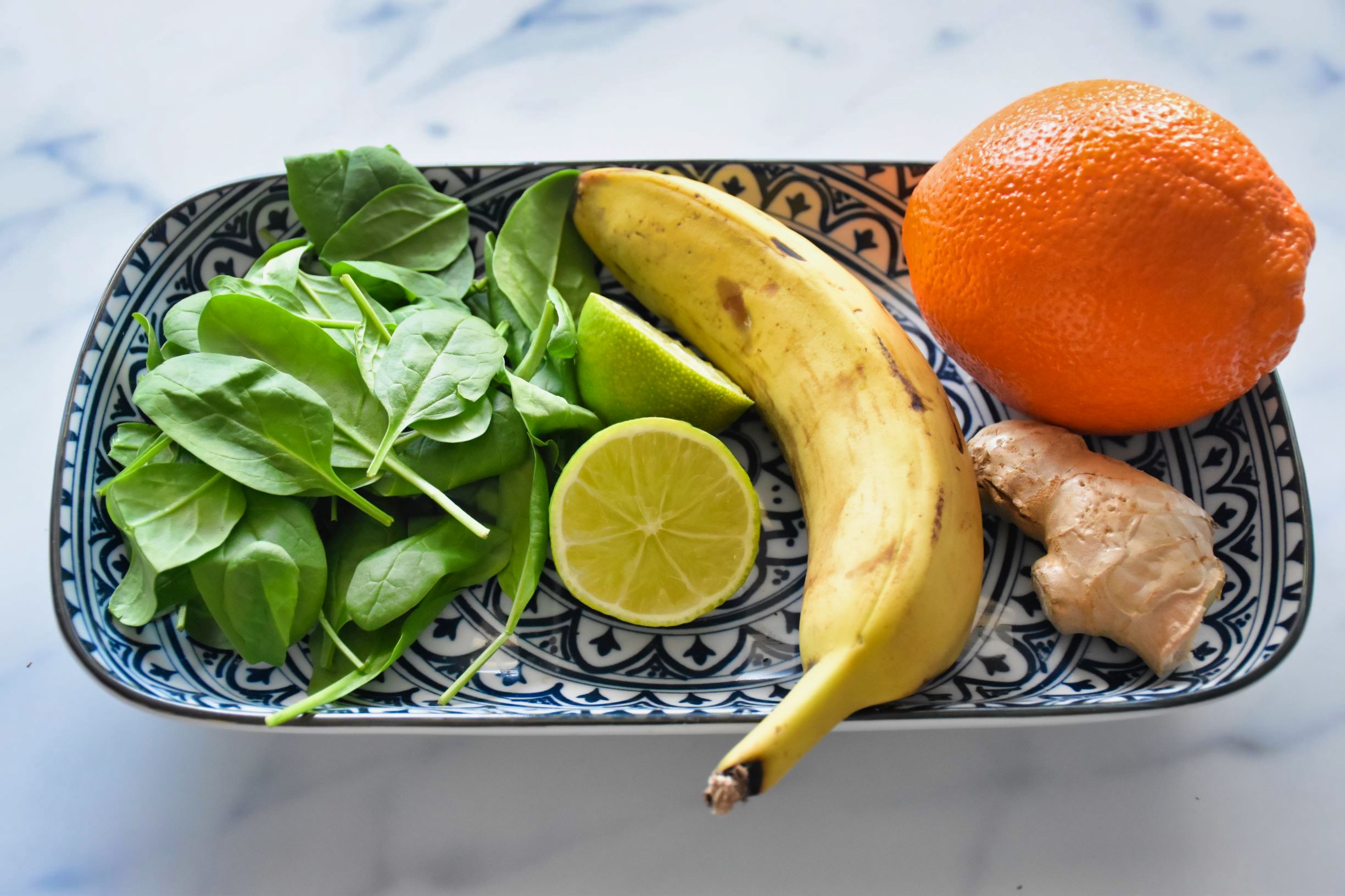 Banana, pomarańczę i imbir pokrój na mniejsze kawałki. Dodaj sok z limonki, szpinak i wodę. Dokładnie zblenduj.